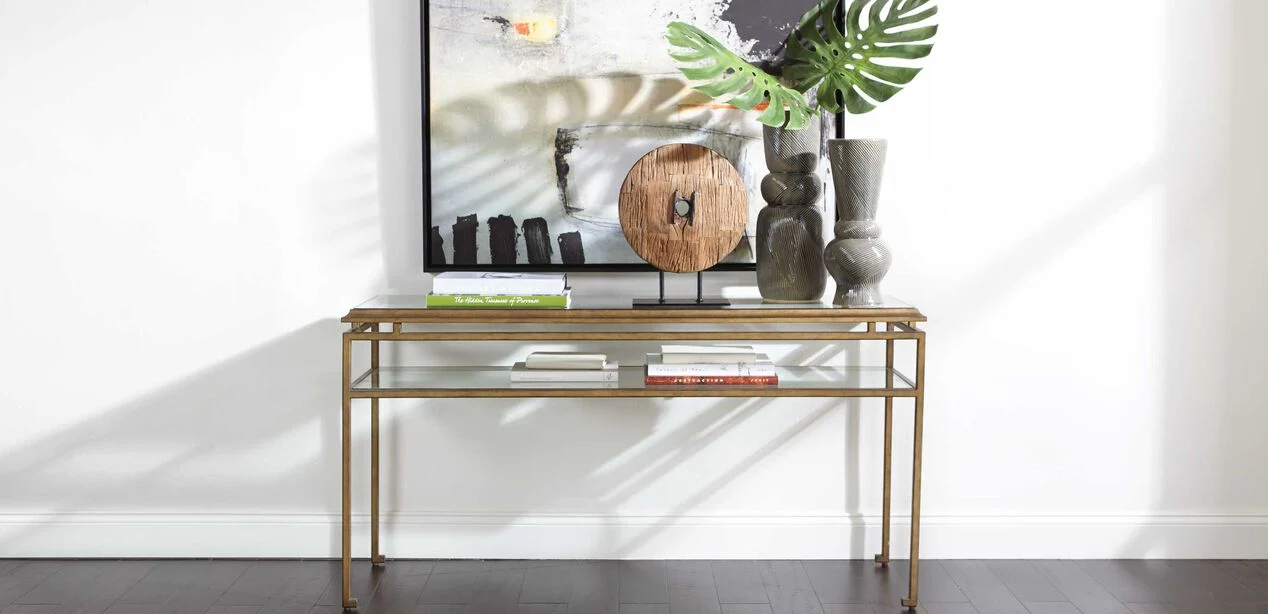Golden (Goldtone) Finish: The console table’s metal frame is finished in a hand-applied aged brass metal (Goldtone) with a light glaze, giving it a rich, vintage, and luminous character.