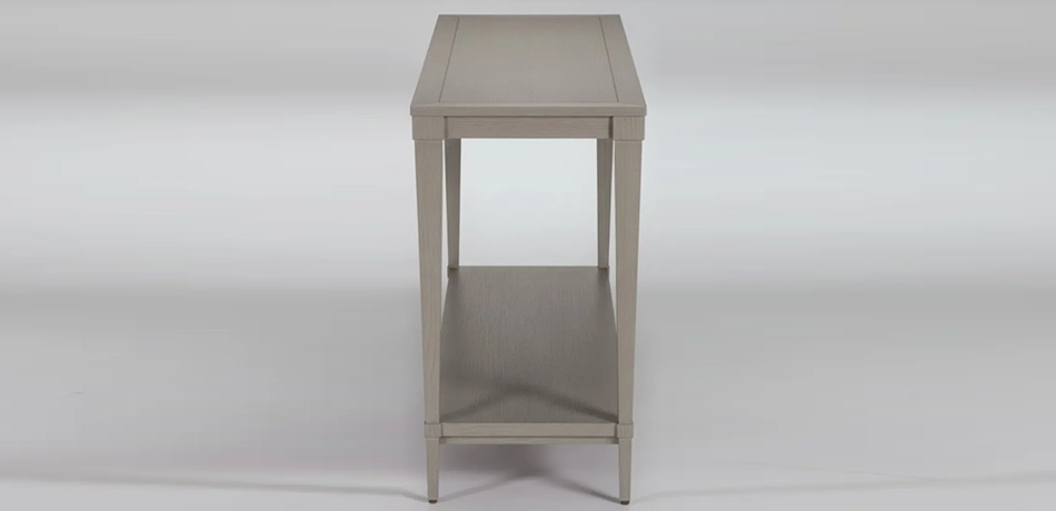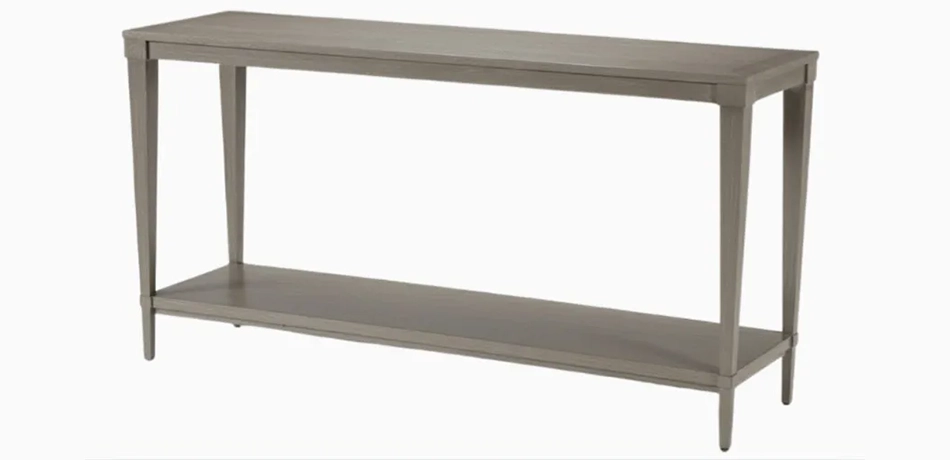 Like your favorite character actor, the Glenavon wood console table has the versatility to play any part. Tuck it behind your sofa for added storage (its bonus lower shelf makes it even more practical), or set it against a wall and decorate it with your favorite collectibles, a gorgeous lamp, lush greenery, and your favorite family photos. Anything but basic, this console table features designer details, like graceful tapered legs and decorative wood molding. Like the character actor it is, Glenavon may not dominate the scene, but your living room wouldn't be the same without it. The Glenavon wood console table is skillfully crafted from quarter-sawn oak for solid construction, with oak veneers* for a consistent and visible surface grain Classic tapered legs, with decorative molding for a designer touch Multilayer wood finish is wire-brushed by hand to bring out the wood grain Tidy storage shelf has plenty of room for books, magazines, decorative accents, and more Available in Mink (487), Chesnut (488) and Gray Flannel (483), three on-trend finishes that coordinate well with our other living room and dining room pieces Coordinate with other pieces in the Glenavon collection to pull your living room look together: wood end tables and a rectangular coffee table are also available Easy-to-use levelers ensure stability, even on uneven floors