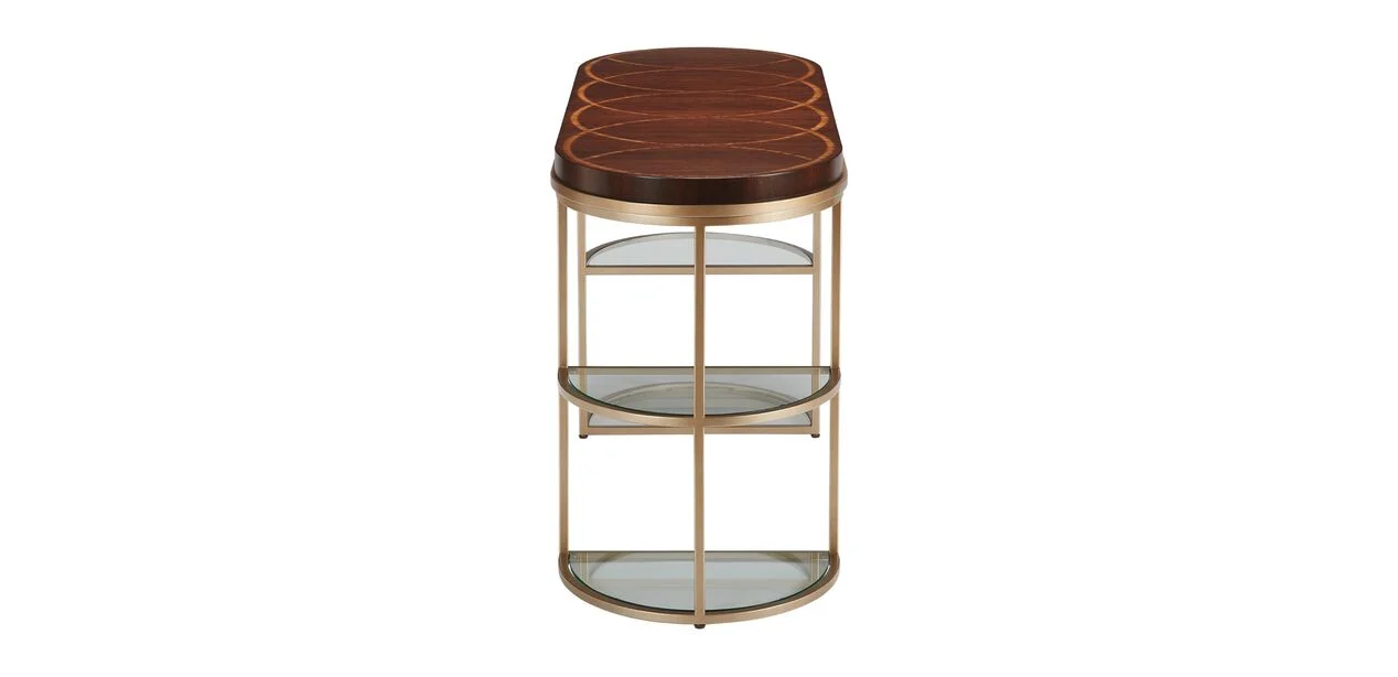 Pedestals/Base: Tempered glass shelves integrated with steel supports finished in satin gold, creating a mix of transparency and shine.