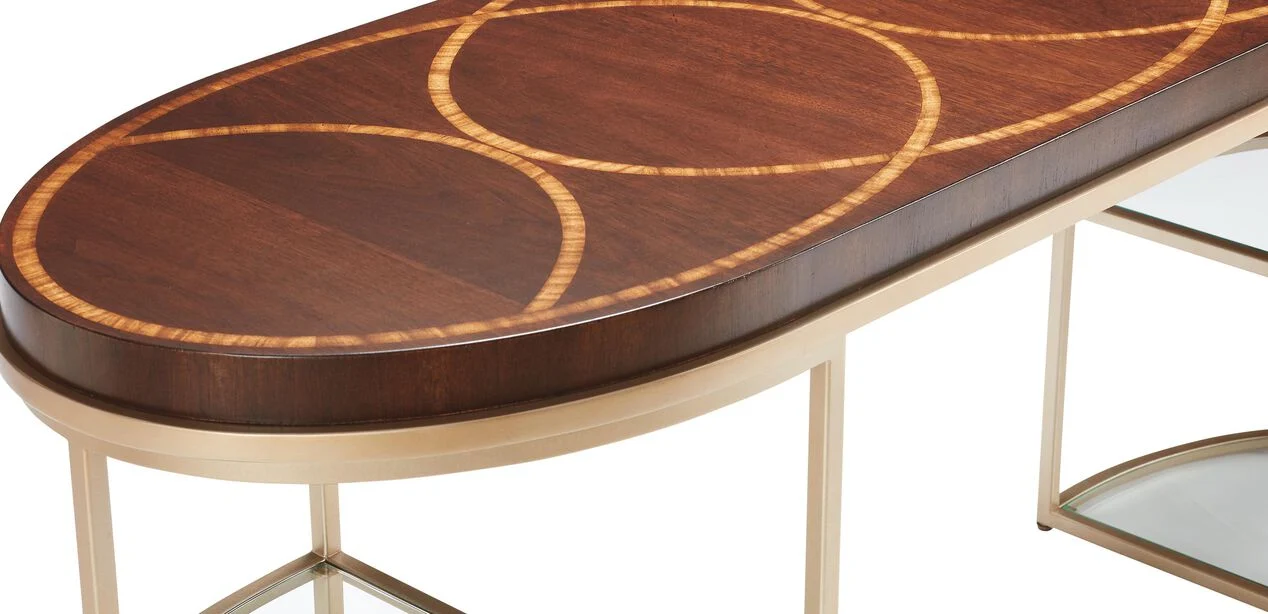 Oval-ended tabletop with rich wood veneers and decorative inlay that draws the eye with its craftsmanship and pattern.