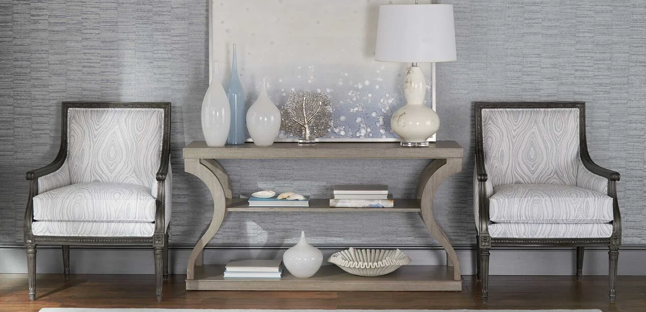 One of our most eye-catching pieces gets a fresh look in oak. This open-concept console table, with a slender middle shelf for storage, definitely has a practical side, but its curved legs and beautiful, fresh, inviting silhouette are the kind of design details that make you fall in love at first sight. No matter where Donatella stands—dining room, entryway, living room, hallway—this stylish oak console table can't help but get noticed. The Donatella console table features an open concept design and graceful curved legs; crafted from oak* and wire-brushed by hand to bring out the wood grain Console table with fixed center shelf; additional shelf space on top of its plinth base Available in Gray Flannel (483) and Sea Salt (723), two on-trend finishes that coordinate beautifully with other Ethan Allen furnishings