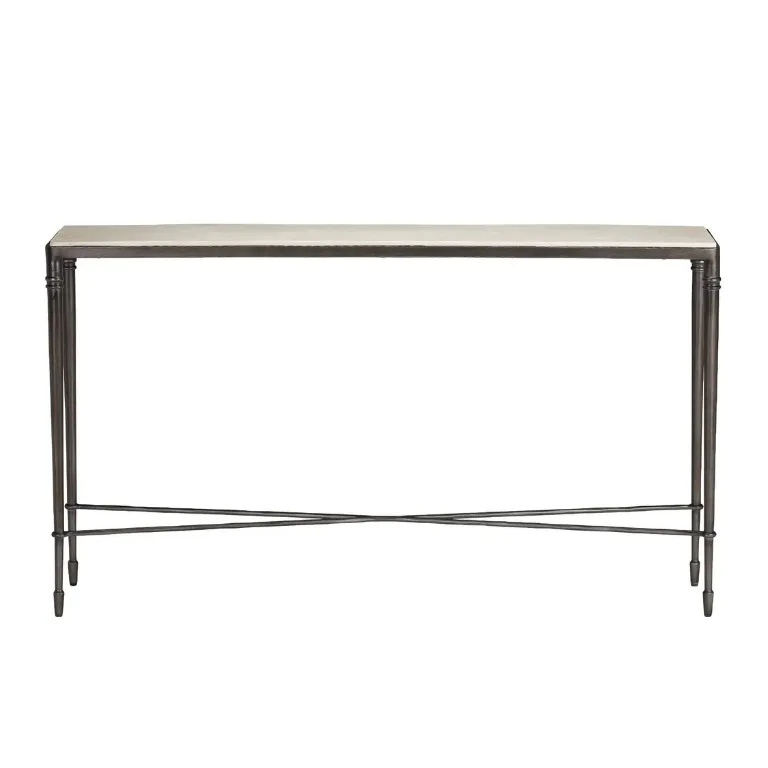 Mixed-material console table. Polished white agate top with hand-cast metal stretcher base.