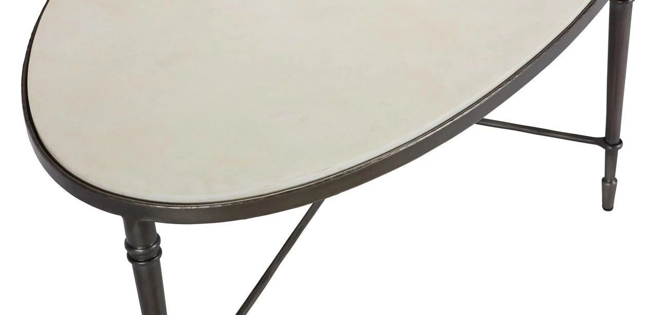 A lovely mixed materials moment suitable for classic and modern décor alike. This round coffee table features a dramatic, hand-cast metal stretcher base, plus a top crafted from white agate. Each tabletop is carefully polished to highlight the stone's one-of-a-kind geometric pattern and natural speckling.