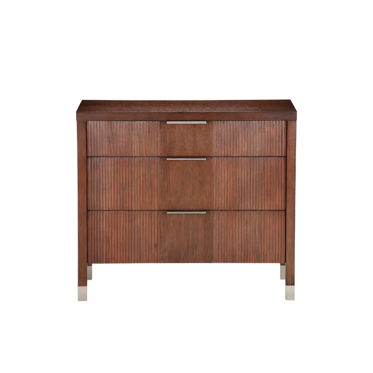 Bring elegant, streamlined design and a relaxed modern vibe into your bedroom. The Valermo three-drawer chest makes it possible, offering sophisticated style along with a healthy helping of storage. A fluted pattern on each drawer front, plus a prominent wood grain created by wire-brushing the oak, adds exceptional, touchable texture. When you're looking for a more perfect union of style and substance, this three-drawer dresser delivers. The Valermo three-drawer chest is skillfully crafted from quarter-sawn oak for solid construction, with oak veneers* for a consistent and visible surface grain A fluted drawer-front pattern, crafted from Indonesian mahogany veneer, adds a designer touch; satin nickel drawer hardware coordinates with the ferrules on the feet Features three soft-close drawers with dovetail construction for long-lasting quality Multilayer wood finish is wire-brushed by hand to bring out the wood grain Available in Mink (487), Gray Flannel (483), and Chestnut (488), three on-trend finishes that coordinate well with other bedroom furnishings in our line Group with other pieces in our Valermo collection, including a tall chest, a double dresser, and night tables in small and large sizes; this tall dresser also coordinates beautifully with our Avon bed Easy-to-use levelers ensure stability, even on uneven floors