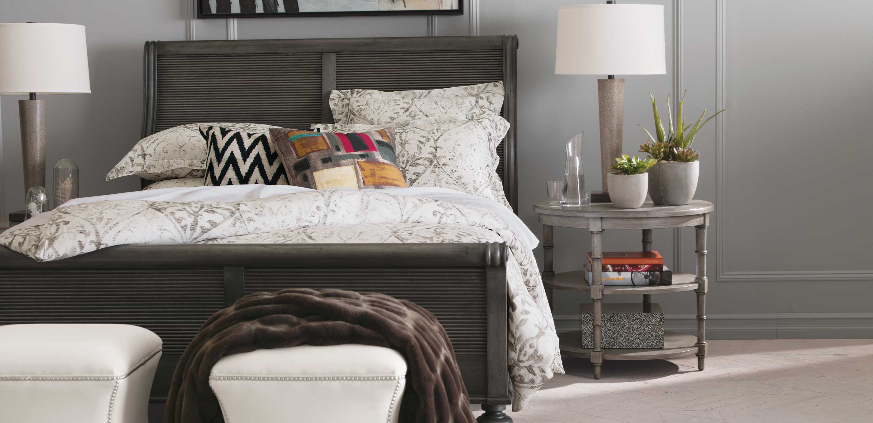 This well-rounded solid oak table has random match veneers and a visible, beautifully textured grain. Allistair works as an end table in a living room or library or as an end table in any stylish bedroom. With its comfortable scale and roomy shelves, the Allistair delivers plenty of open storage—and a confident style statement in any setting. Crafted from solid oak, using random match veneers Two storage shelves Faux bamboo turnings on legs Our swatches are an excellent representation of our furniture finishes. Differences in wood grain may cause slight variations on the final piece. Additional finishes are available for order in Design Centers.