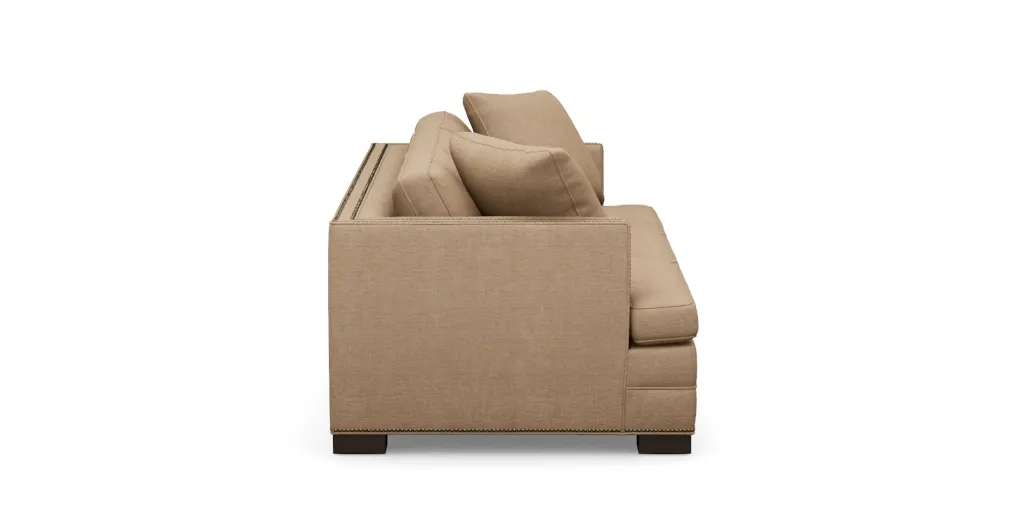 The Astor has all the trappings of a generously scaled shelter sofa, with just a touch of transitional glam (the optional double nailhead trim helps). Its streamlined profile is accentuated by slightly set back track arms that wrap around the back. Available as an 80-inch sofa and as an 89-inch sofa, Astor has architectural attitude that's softened by loose back cushions and deep T-cushions—the ultimate in modern comfort. Track arms combined with loose back cushions and deep T-cushions for tailored and timeless styling Poly-wrapped foam cushions provide a soft, structured seat; two 21" pillows included for added comfort and style versatility Engineered panel frame for superior strength and long-lasting durability Legs finished in Raisin (939), a rich, cool dark brown water-based finish Stain-resistant fabric prevents damage from spills; great choice for homes with families and pets Sleeper: Standard 80" innerspring queen mattress offers your guests a comfortable, supportive night sleep Also available in leather The fabrics and options shown here are our most popular, but if you don't see what you're looking for, visit a Design Center to view additional options