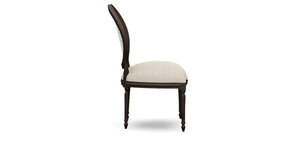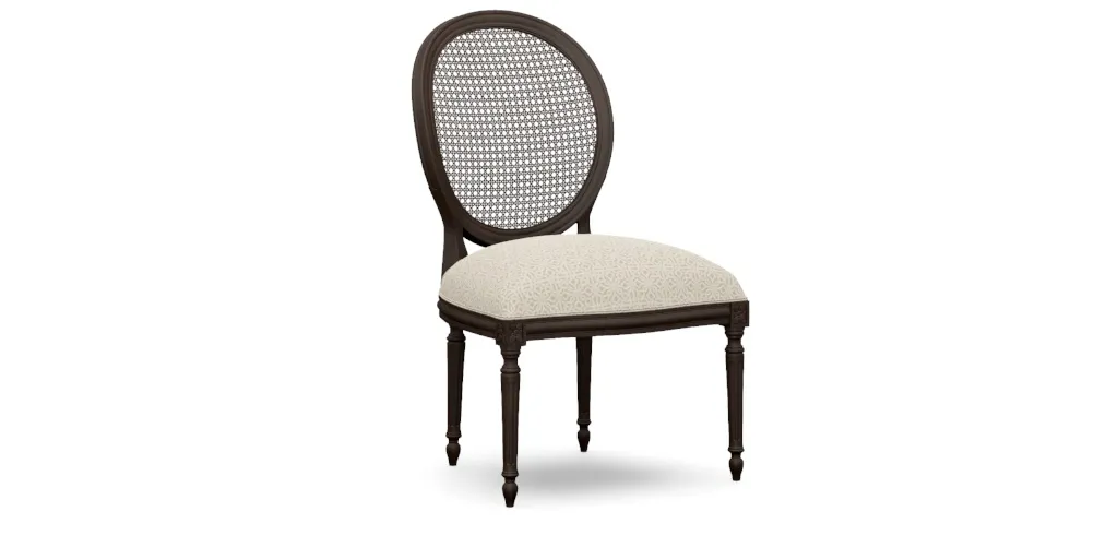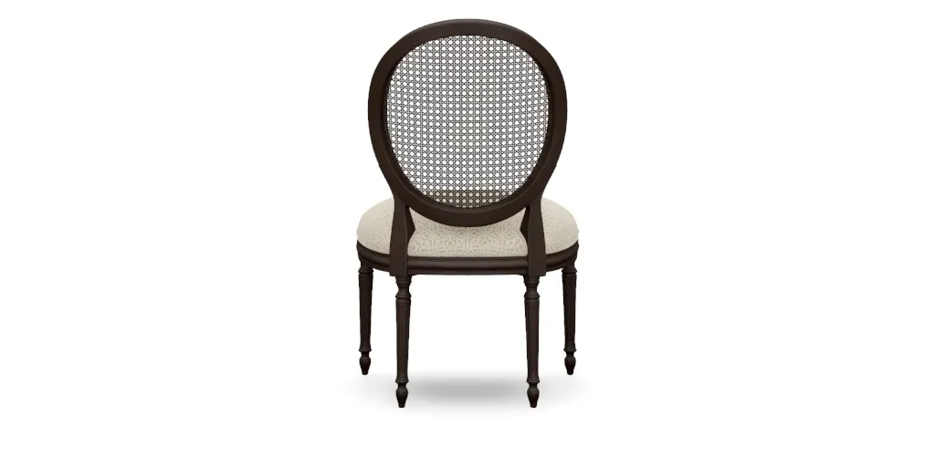 Refined without ruffles. You'll be sitting pretty on this French-inspired chair. The cane back gives the piece an air of lightness. To bring in a garden feeling, you might choose to have the cane hand-painted with a lattice pattern. With exquisite hand-detailing and double-welting.