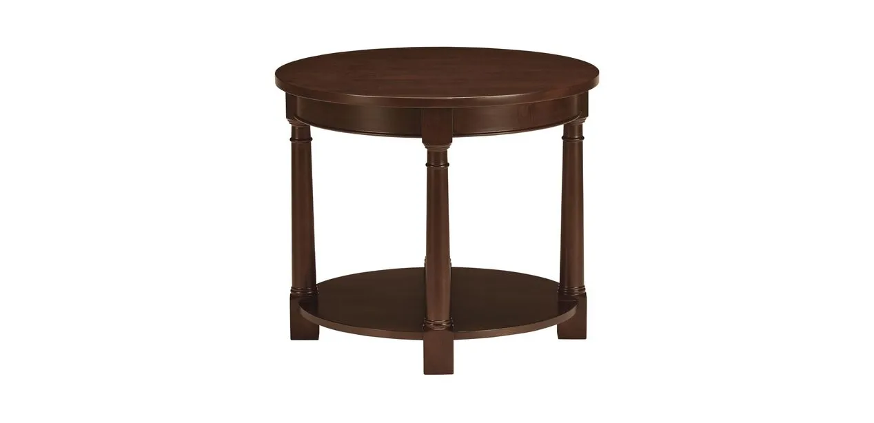 Handcrafted in our North American workshops and now available for fast delivery in select finishes. Connall's round frame includes a lower open shelf; neoclassical posts raise the elegance factor. Combines beautifully with any of our Quick Ship Connall coffee tables.
