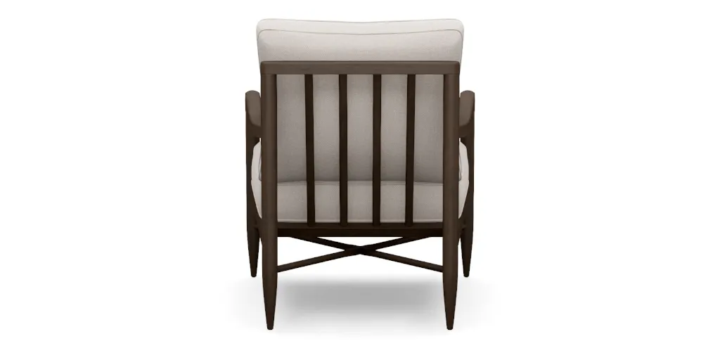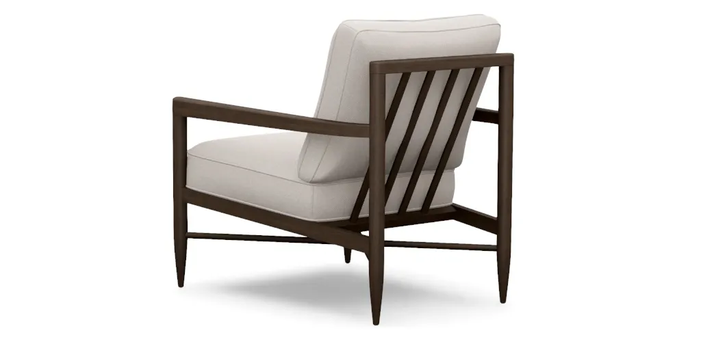 Elgin offers a narrow exposed wood frame, curved arms, and deep-pitched seat with cross stretchers. It has a striking mid-century modern design style with a comfortable, casual vibe. Hand-tailored in our North American workshops.