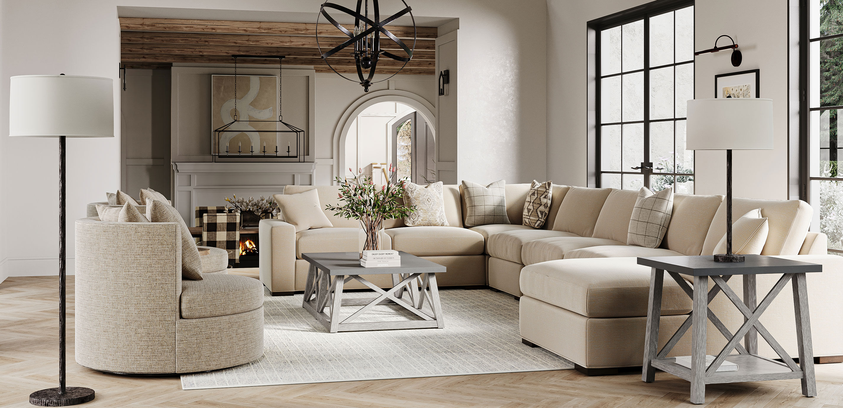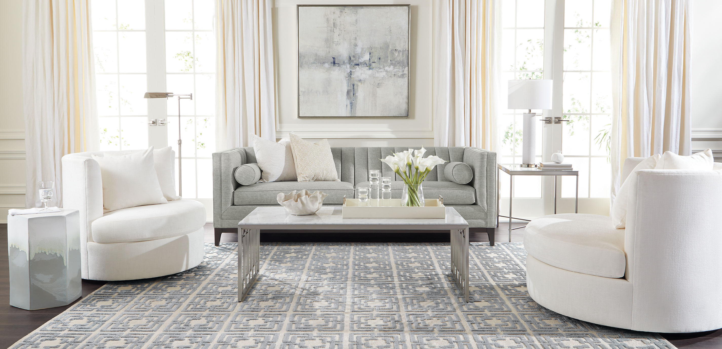 With size options to fit any space and an irresistible, fashionably round profile, our Solenne swivel chair is as close as it gets to poetry in motion. Select your favorite fabric, from solid colors to patterns galore, and we'll custom-craft your Solenne in our North American workshops. An inviting round swivel chair available in 3 sizes: 36", 42", and 48". 36" Swivel includes 1-18" & 1-20" pillows; 42" Swivel includes 1-22" & 1-20" pillows; 48" Swivel includes 2-25" & 1-20 pillows Tailored by hand over a durable engineered panel frame Poly-wrapped foam cushions provide a soft, structured seat We offer our most popular options online. To view every available fabric and custom option, visit a Design Center.