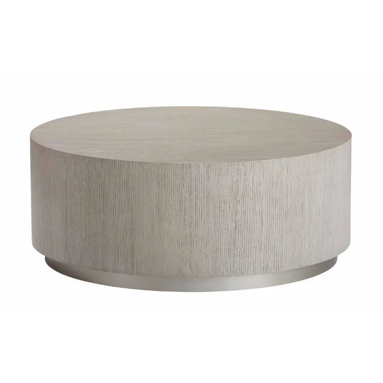Center your living space around the Braemore round coffee table. Within such an elemental form, the materials take center stage: The round plinth base gets its shimmer from a satin nickel finish, while a top fashioned from wood gets eye-catching appeal from an absolutely stunning grain pattern. A great choice for smaller living rooms, this round plinth coffee table provides plenty of surface space without taking up too much floor space. Braemore is a minimalist, round plinth-base coffee table, with a transitional profile that's perfect for smaller living spaces The plinth base is banded in steel, which is finished in a warm satin nickel for subtle yet distinctive luster Multilayer wood finish is wire-brushed by hand to bring out the wood grain Available in multiple finishes: Coffee tables with the unique Alabaster (733) finish are crafted from olive ash burl, with olive ash burl veneers* arranged in an elegant parquet pattern Coffee tables with the more casual Gray Flannel (483) or Mink (487) finishes are crafted from quarter-sawn oak,* with hand-applied oak veneers for a consistent and visible surface grain Braemore Rectangular Plinth-Base Console Table, Braemore Round End Table, and Braemore Rectangular Plinth-Base Coffee Table also available Easy-to-use levelers ensure stability, even on uneven floors