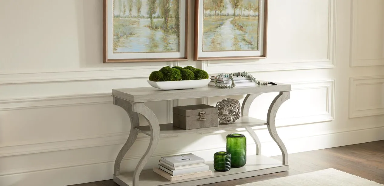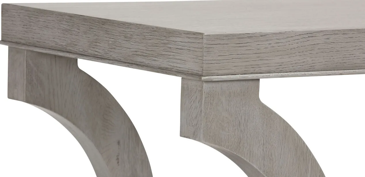 One of our most eye-catching pieces gets a fresh look in oak. This open-concept console table, with a slender middle shelf for storage, definitely has a practical side, but its curved legs and beautiful, fresh, inviting silhouette are the kind of design details that make you fall in love at first sight. No matter where Donatella stands—dining room, entryway, living room, hallway—this stylish oak console table can't help but get noticed. The Donatella console table features an open concept design and graceful curved legs; crafted from oak* and wire-brushed by hand to bring out the wood grain Console table with fixed center shelf; additional shelf space on top of its plinth base Available in Gray Flannel (483) and Sea Salt (723), two on-trend finishes that coordinate beautifully with other Ethan Allen furnishings
