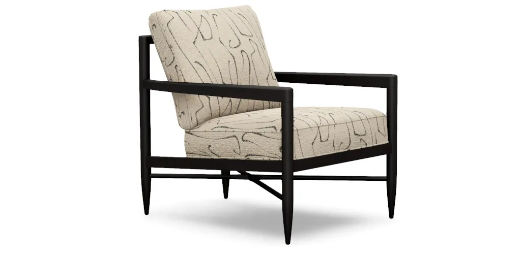 Elgin offers a narrow exposed wood frame, curved arms, and deep-pitched seat with cross stretchers. It has a striking mid-century modern design style with a comfortable, casual vibe. Hand-tailored in our North American workshops.
