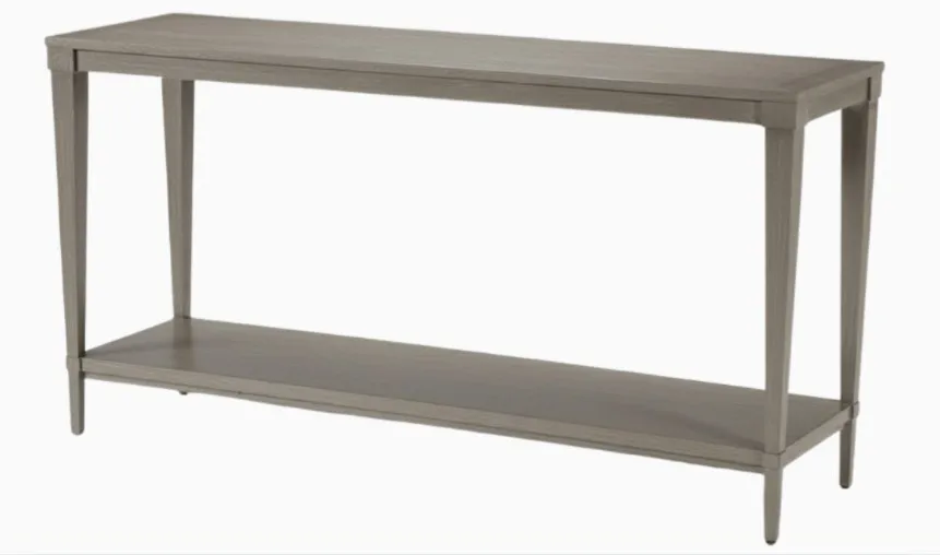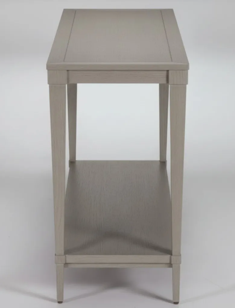 Like your favorite character actor, the Glenavon wood console table has the versatility to play any part. Tuck it behind your sofa for added storage (its bonus lower shelf makes it even more practical), or set it against a wall and decorate it with your favorite collectibles, a gorgeous lamp, lush greenery, and your favorite family photos. Anything but basic, this console table features designer details, like graceful tapered legs and decorative wood molding. Like the character actor it is, Glenavon may not dominate the scene, but your living room wouldn't be the same without it. The Glenavon wood console table is skillfully crafted from quarter-sawn oak for solid construction, with oak veneers* for a consistent and visible surface grain Classic tapered legs, with decorative molding for a designer touch Multilayer wood finish is wire-brushed by hand to bring out the wood grain Tidy storage shelf has plenty of room for books, magazines, decorative accents, and more Available in Mink (487), Chesnut (488) and Gray Flannel (483), three on-trend finishes that coordinate well with our other living room and dining room pieces Coordinate with other pieces in the Glenavon collection to pull your living room look together: wood end tables and a rectangular coffee table are also available Easy-to-use levelers ensure stability, even on uneven floors